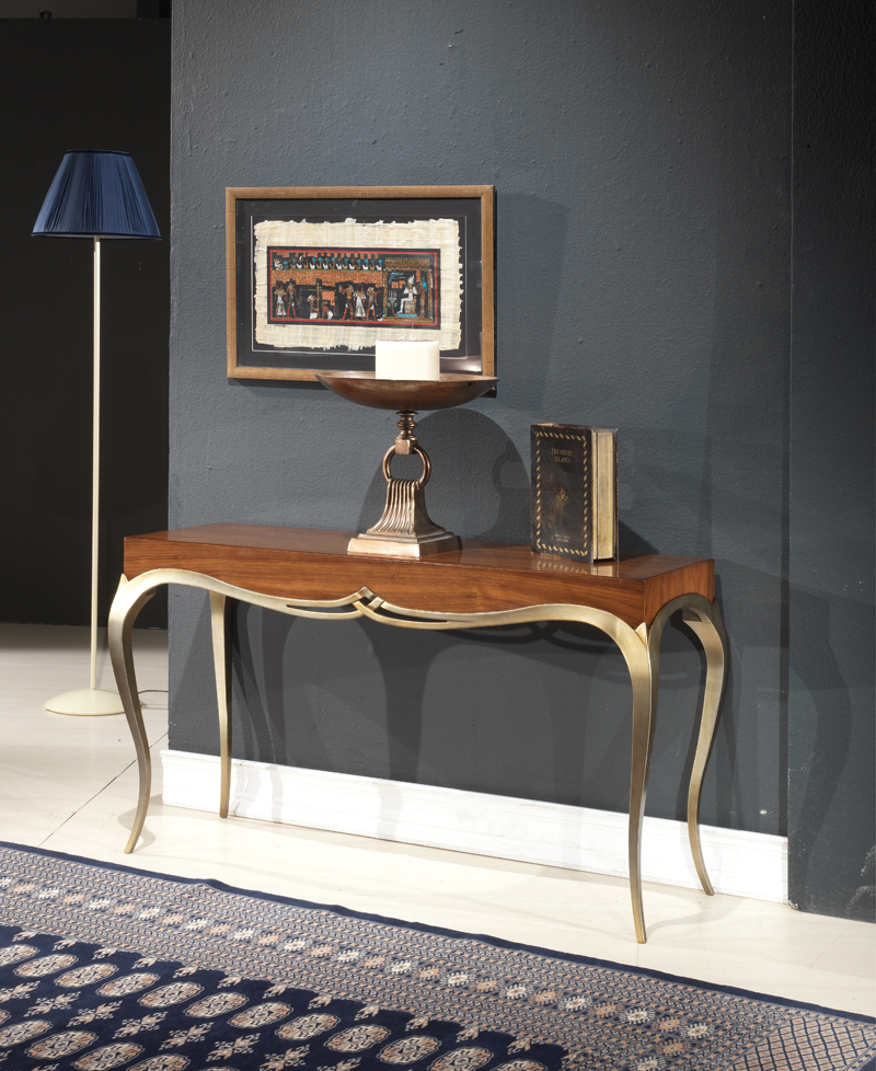 Κλασική κονσόλα με καρυδιά στο καπάκι και πατίνα χρυσή στη βάση.