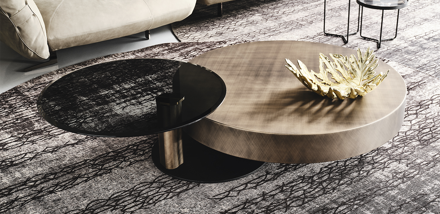 Μοντέρνο τραπεζάκι σαλονιού σε μπρονζέ πατίνα.Συνοδεύεται με επεκτεινόμενο τραπεζάκι παραγόμενο απο κρύσταλλο φιμέ.Παράγεται σε διαστάσεις της επιλογής σας και σε χρωματισμούς της επιλογής σας,Η διάσταση της φωτογραφίας είναι Φ115 και Φ75 το συνοδευτικό.