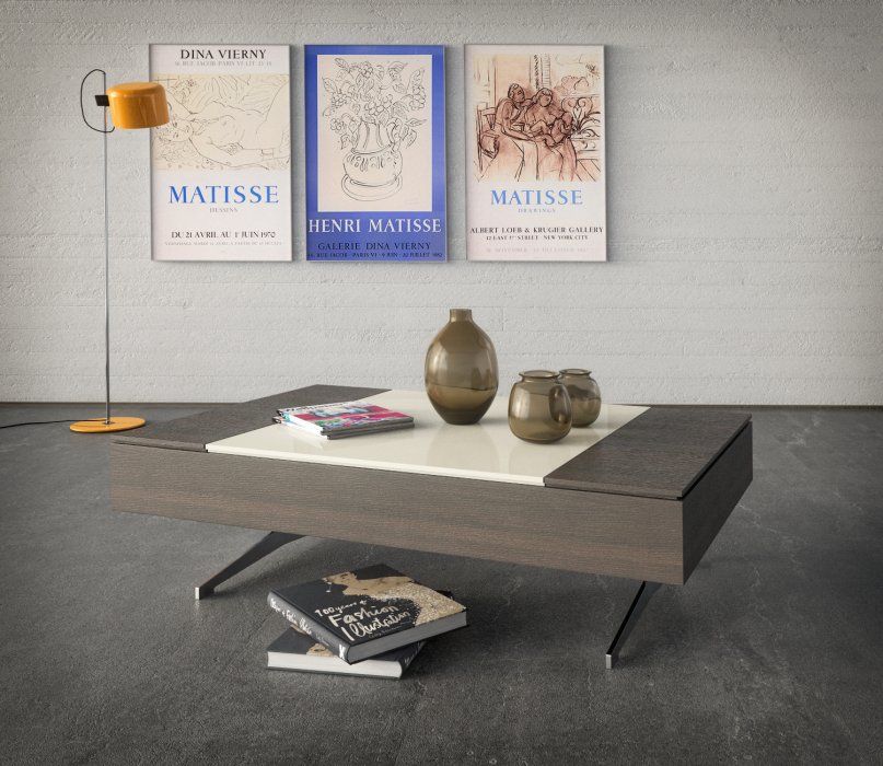 Μοντέρνο τραπεζάκι σαλονιού με μηχανισμό ανύψωσης στην επιφάνεια.