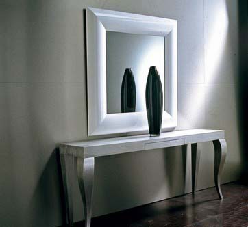 Κλασική κονσόλα σε ασημί χρώμα με άσπρο λακαριστό καπάκι και καθρέπτη.